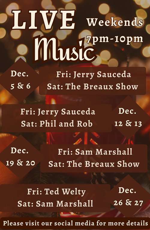 Live music every Friday & Saturday, 7:30-10:30 PM in the lounge. Dine with us and enjoy the perfect ambiance!